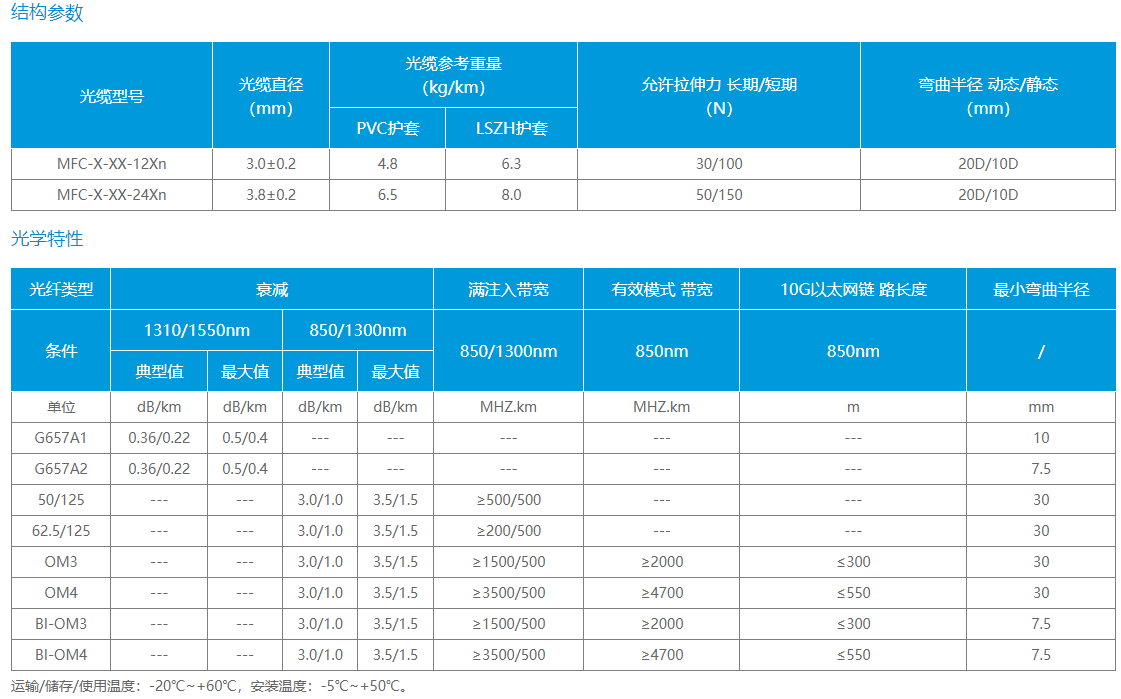- 满足 YD/T 1258.4、ICEA-596、GR-409、IEC 60794-2-20/21 等标准; PVC 分别通过 UL OFNR、OFNP 认证的产品; LSZH 产品选用不同材料,可以满足 IEC60332-1 或 IEC60332-3C。